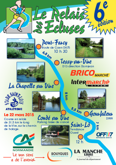 Course en relais de 31,5 km le long de la Vire, sur le chemin de halage. 5 coureurs se transmettent un témoin.