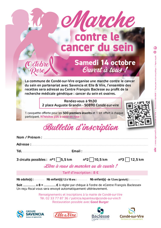 La commune de Condé-sur-Vire organise la 2ème édition de la marche contre le cancer du sein en partenariat avec Savencia et Elle & Vire, le samedi 14 octobre, l’ensemble des recettes sera versé au Centre François Baclesse au profit de la recherche médicale génétique : cancer du sein et ovaires. - 3 circuits proposés : - 1 : 5,5 km - 2 : 10,5 km - 3 : 12 km µ Libre à vous de marcher ou de courir ! ð Rendez-vous SAMEDI 14 OCTOBRE à 9h30 – place Auguste Grandin